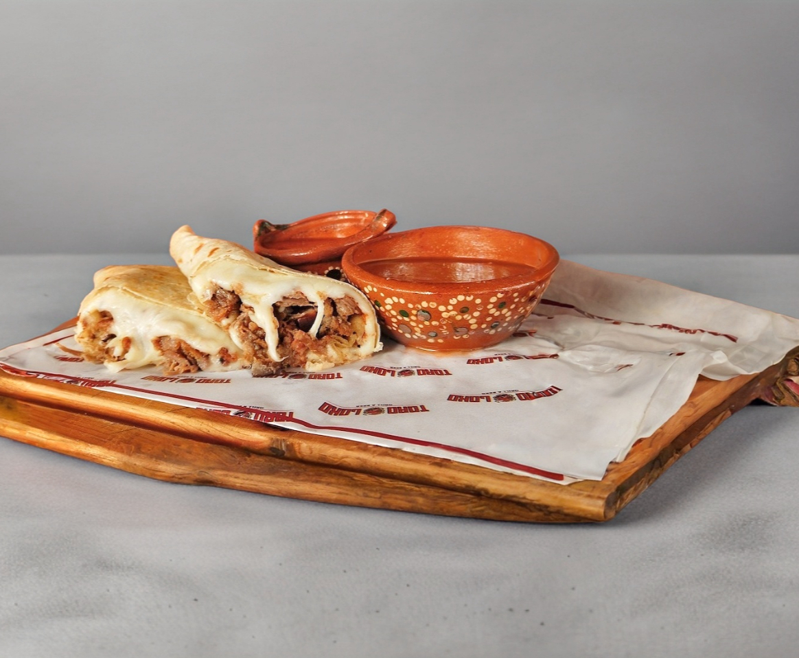 Tortilla de harina grande con salchicha polaca, carne, cebolla, queso y aguacate.