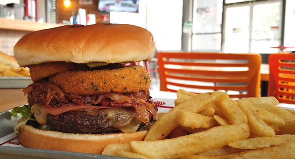 150 gr. de carne 100 % de res, mantequilla, tomate, lechuga, tocino, chilli beans y queso cheddar.