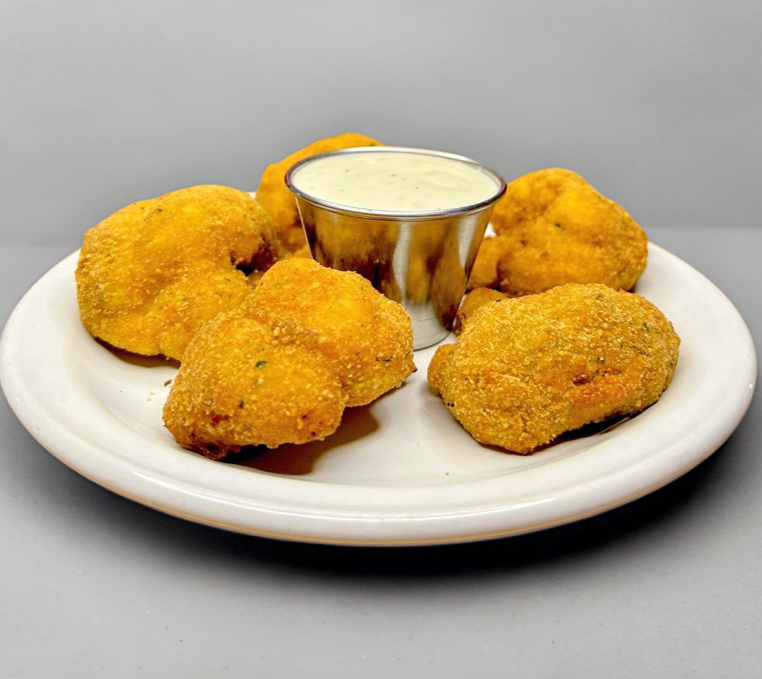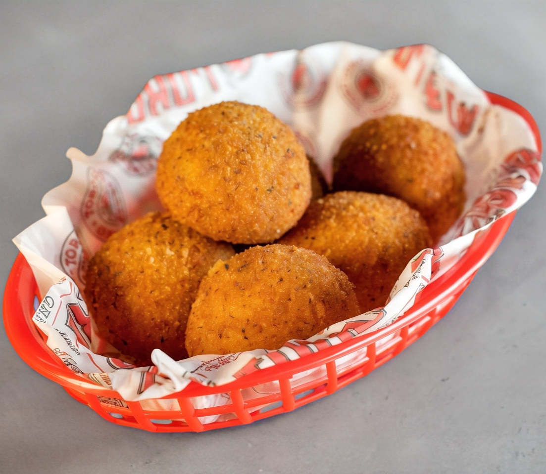 6 bolitas de queso con papa empanizadas servidas con tu aderezo favorito.