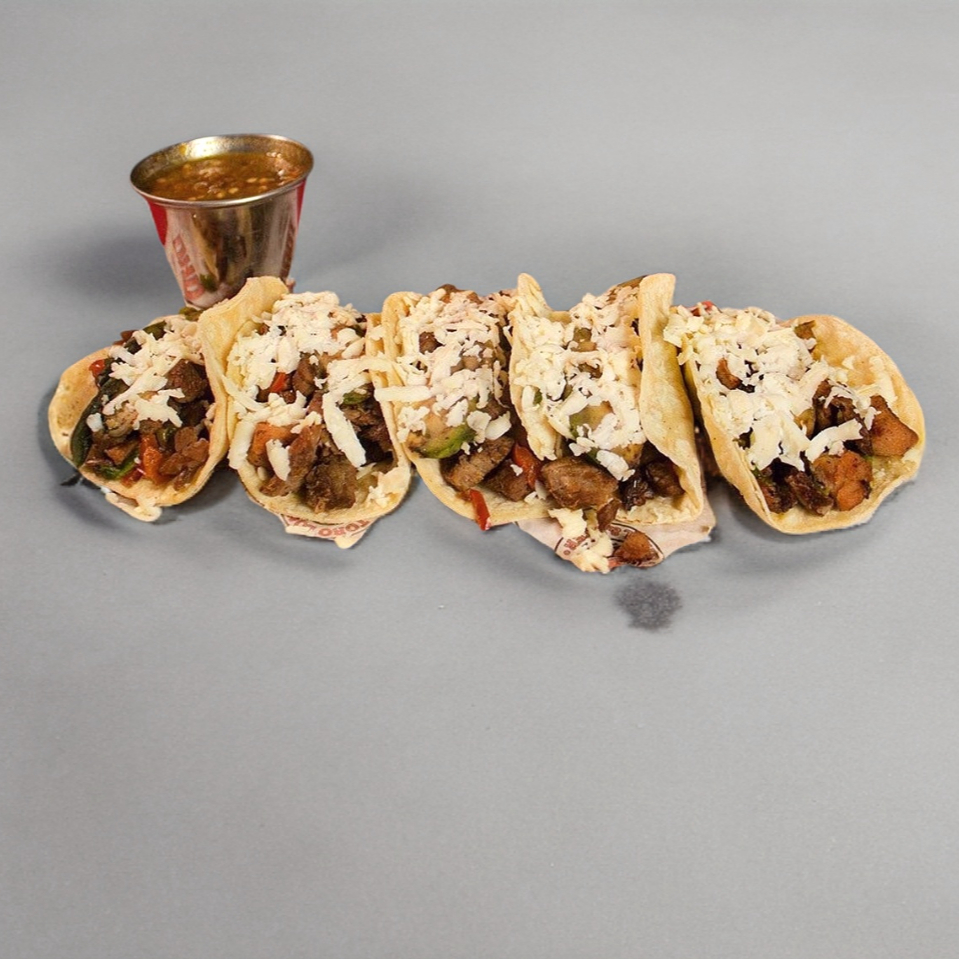 5 Tacos con tortilla de maíz, 150 gr. de fajita de res calidad angus. Acompañados con cebolla asada y salsa.