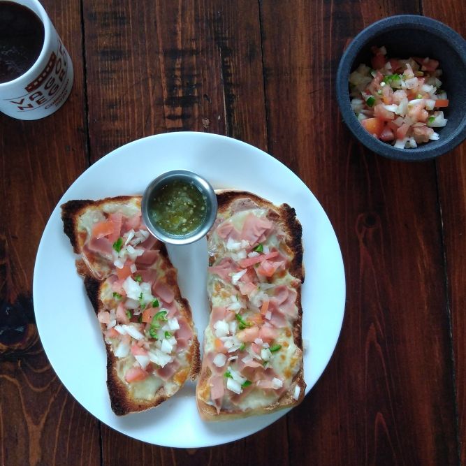Exquisito pan tipo ciabatta con frijoles refritos y queso gratinado acompañado por pico de gallo y salsa verde