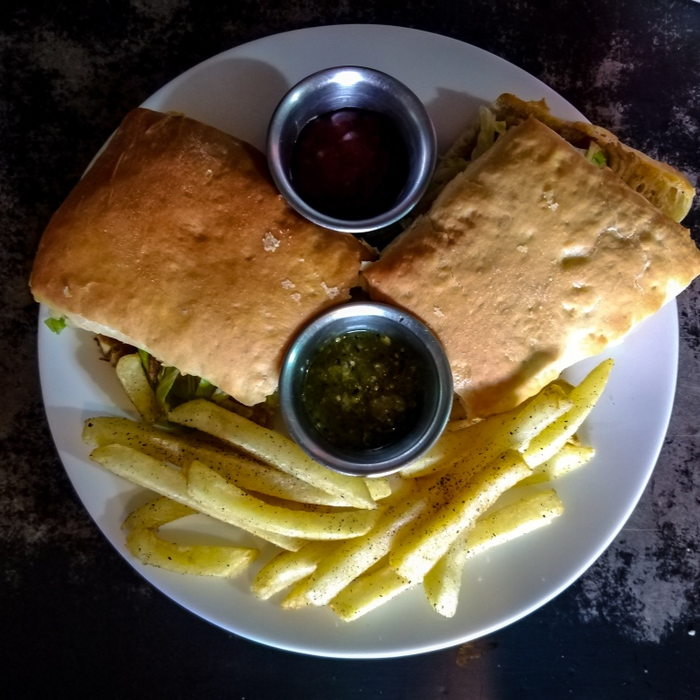sandwich de pan de ciabatta con pechuga de pollo empanizada bañada de salsa bufallo con queso mozarella gratinado , tomate, cebolla, lechuga, moztasa y mayonesa. Acompañado con ranch, catsup y papas a la francesa