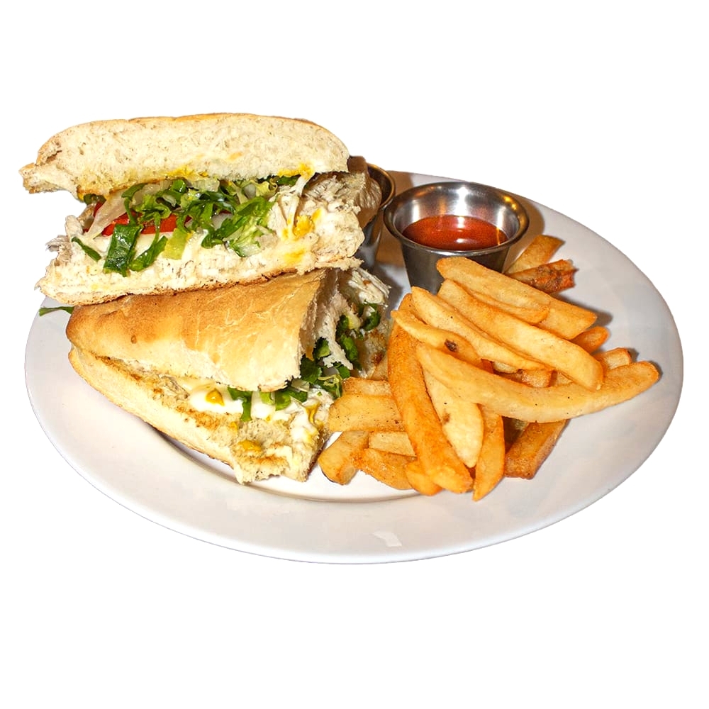 Con queso manchego gratinado, lechuga, tomate y cebolla desflemada acompañada de papas a la francesa, catsup y salsa pesto.