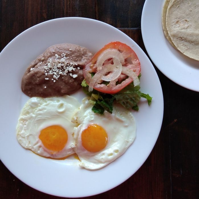 Huevos estrellados acompañados de frijoles refritos y ensalada