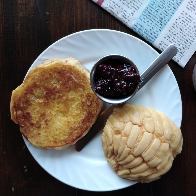 Deliciosa concha hecha por nosotros y dorada con mantequilla a la plancha acompañada de mermelada de fresa o zarzamora.