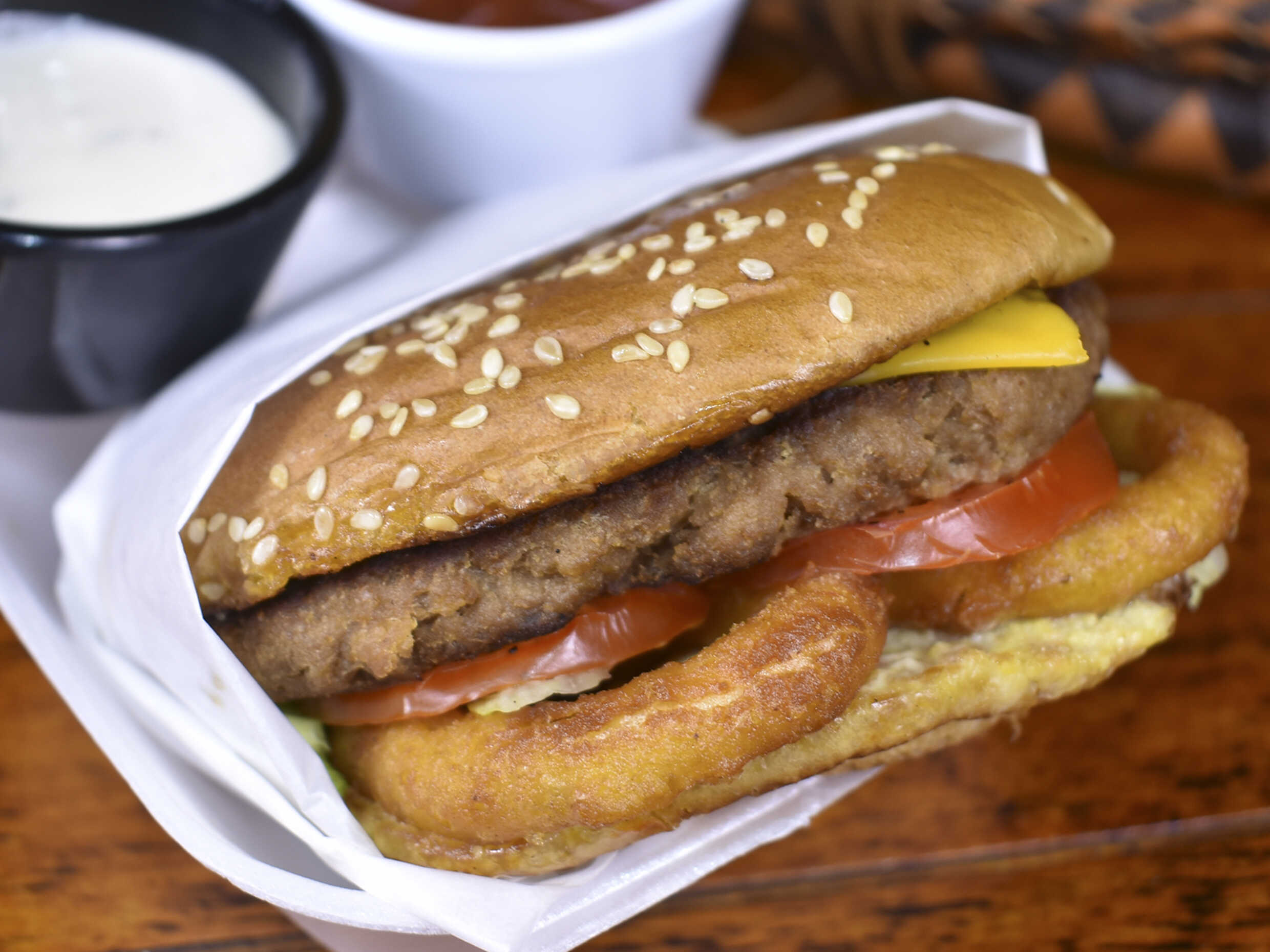 Carne de res, queso amarillo, aros de cebolla, salsa BBQ, lechuga, tomate y mayonesa