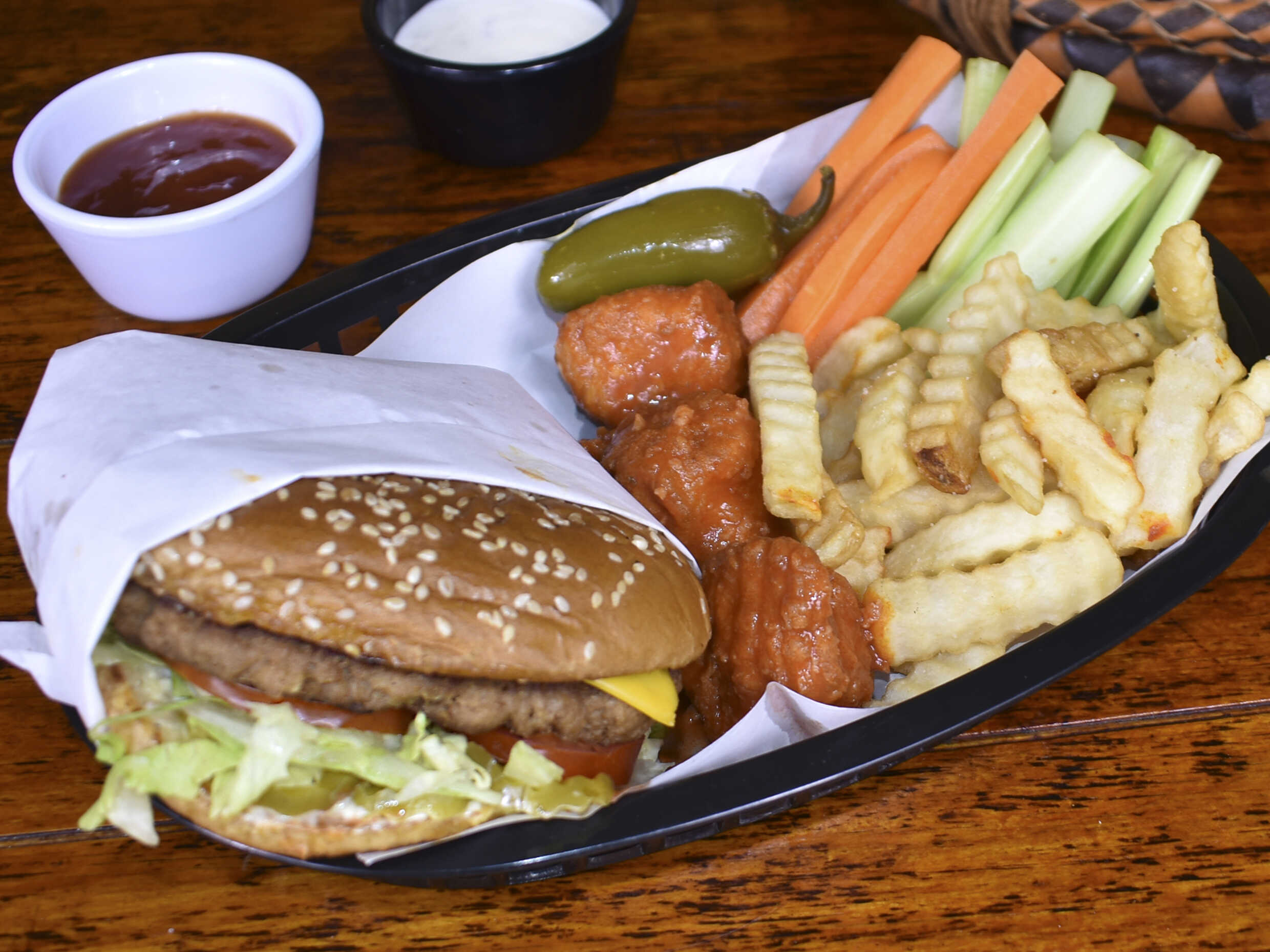 Hamburguesa, papas fritas, refresco y 3 alitas o boneless