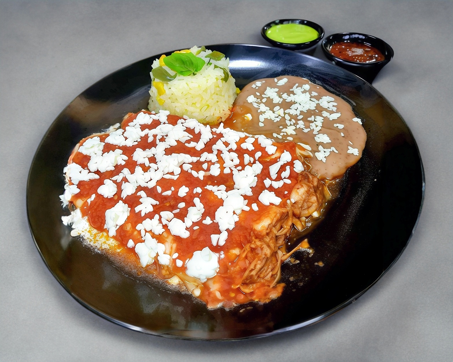 Orden de cuatro entomatadas cubiertos con queso fresco, acompañadas con frijoles y arroz.