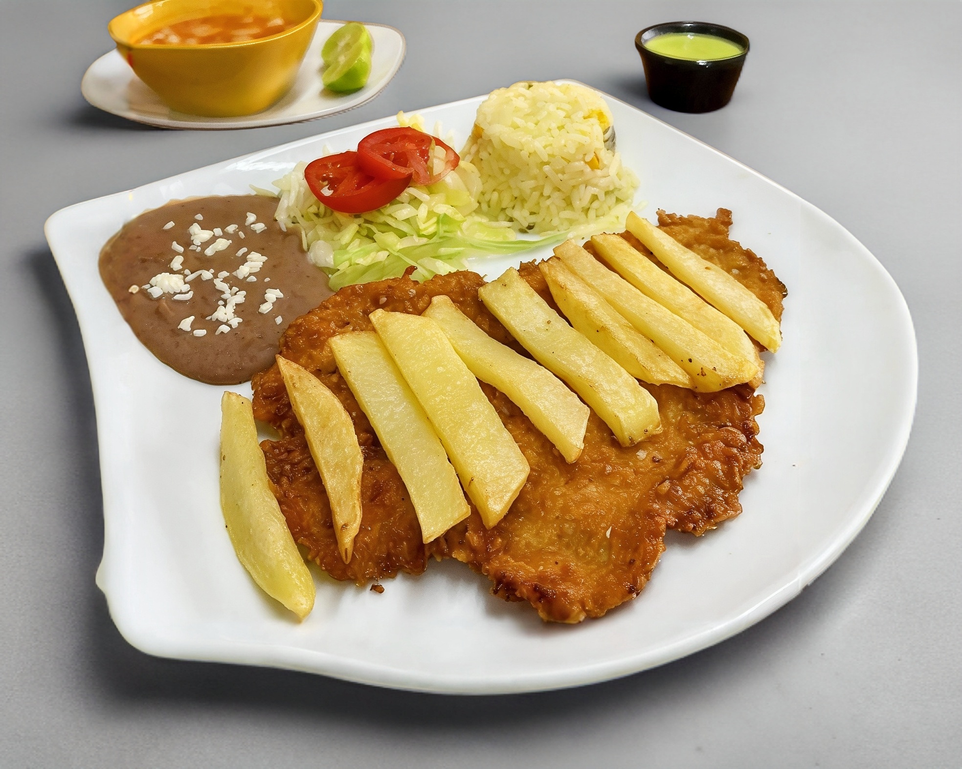 Deliciosa milanesa previamente marinada y empanizada con el sazon de la casa, acompañada con frijoles, arroz y papas fritas.