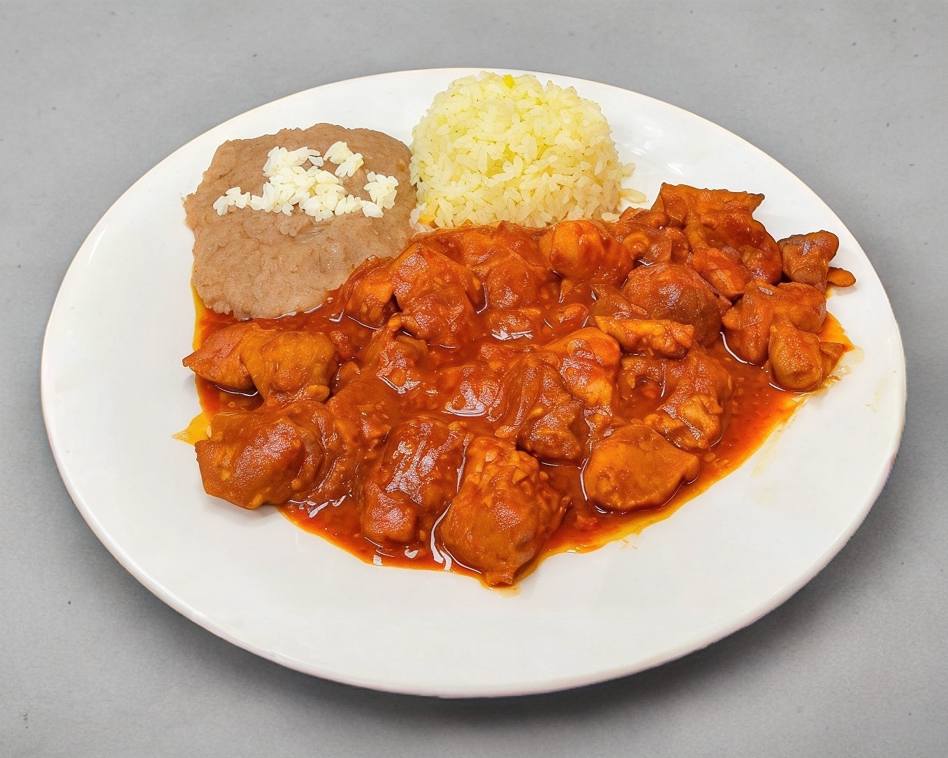 Platillo de guisado acompañado de frijoles y arroz.