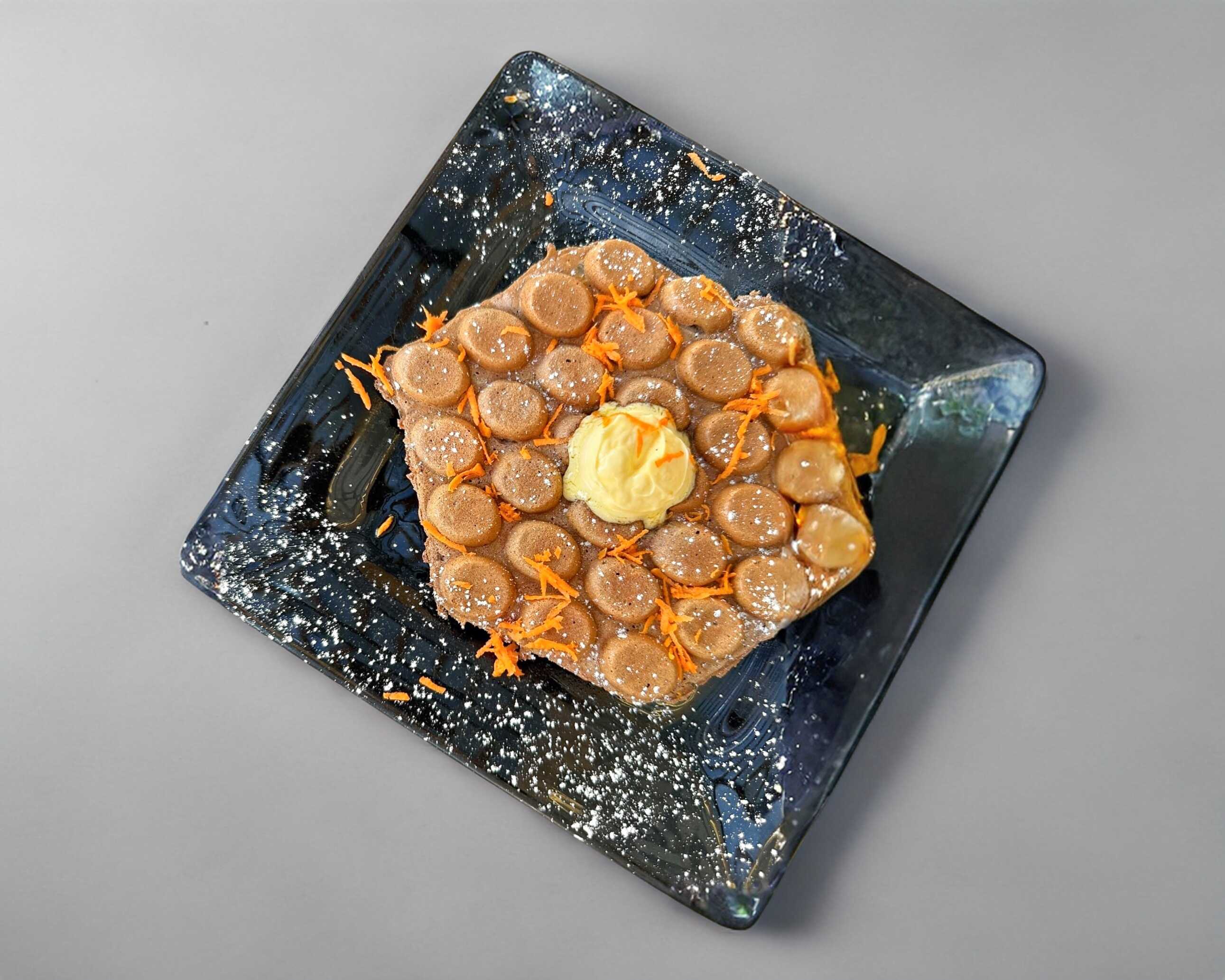 Delicioso, suave y esponjadito waffle de vainilla con mantequilla y miel de maple