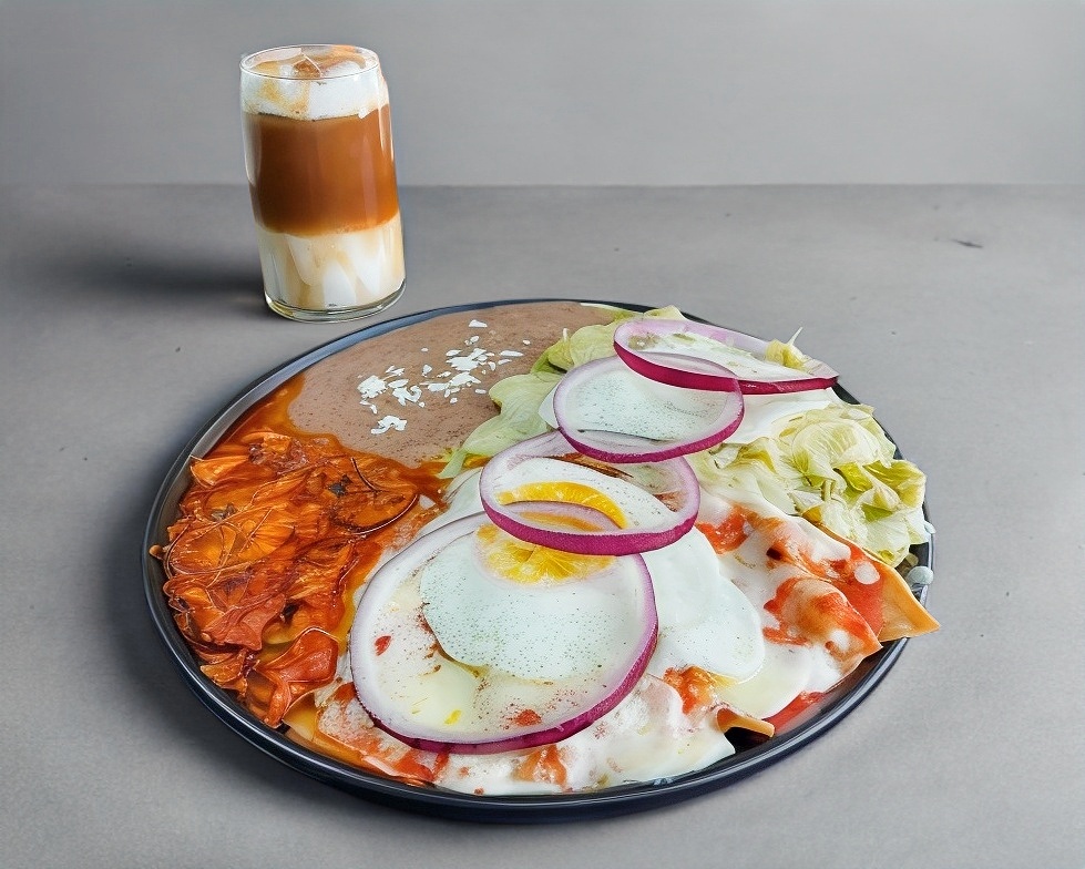 Totopos caseros gratinados con queso mozzarella, dos huevos estrellados o revueltos, bañados en salsa de tomate de la casa, acompañados con el guiso de tu elección y frijoles