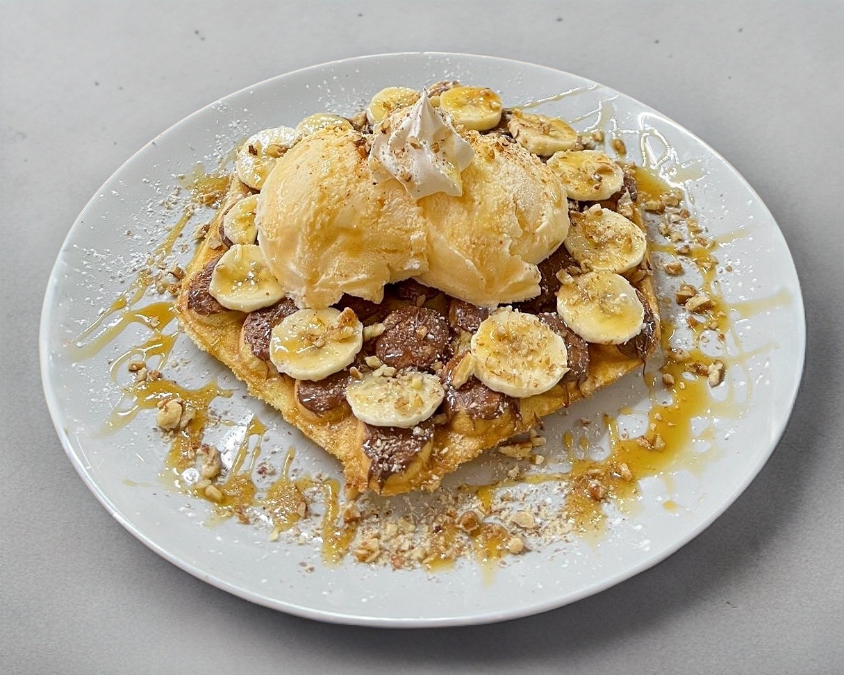 Delicioso, suave y esponjadito waffle cubierto de Nutella, rebanadas de platano, nuez, syrup de caramelo y nieve de vainilla