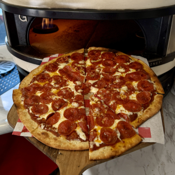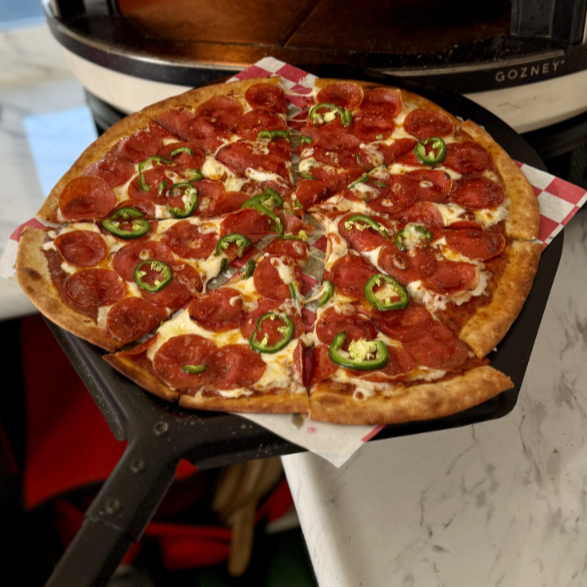 Pepperoni, queso mozzarella, salsa de tomate de la casa, chile jalapeño