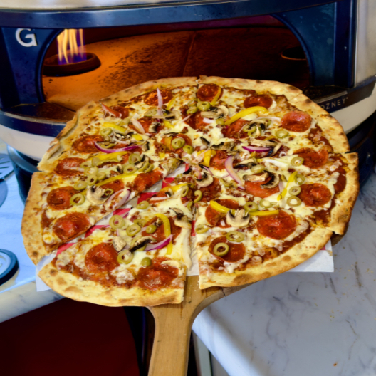 Pepperoni, queso mozzarella, tocino, champiñones, aceituna verde, cebolla y pimiento