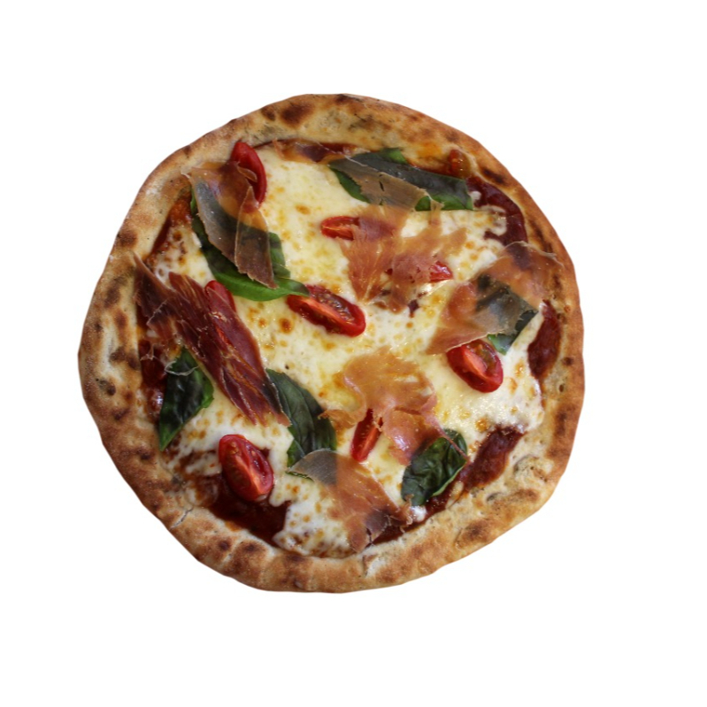 Queso mozzarella, jamon serrano, arugula, tomate cherry, salsa de tomate de la casa
