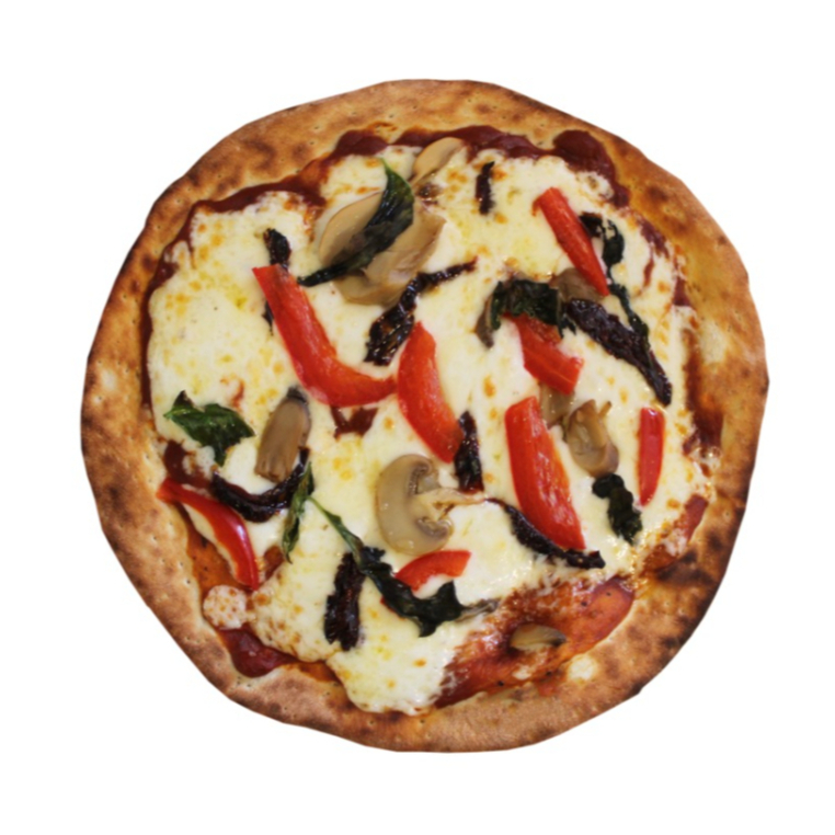 Queso mozzarella, champiñones, albacar, tomate deshidratado, pimiento, salsa de tomate de la casa
