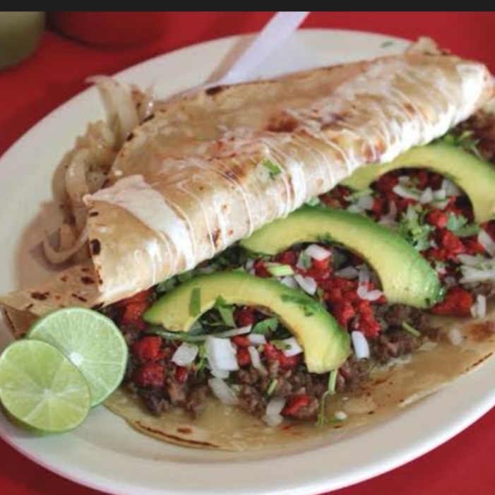Tortilla De harina , carne de res queso fundido , cilantro ,cebolla y aguacate