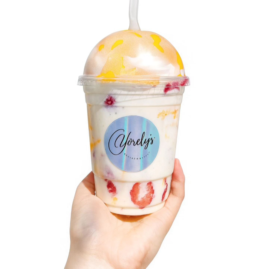 capas de mango y fresa picados, cubiertos con nuestra deliciosa crema de la casa.