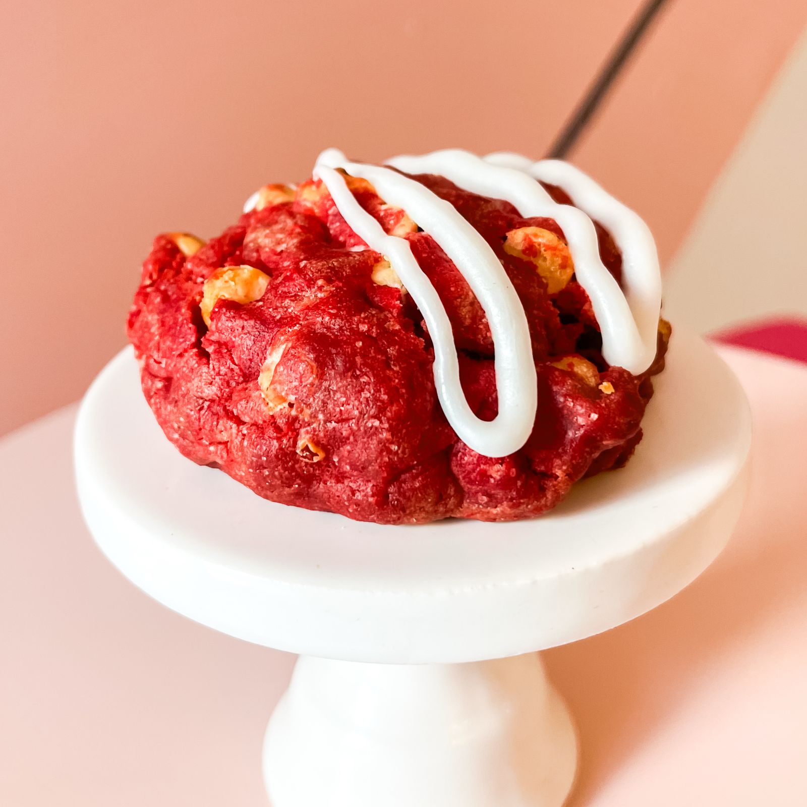 Galleta estilo New York de 100 g, sabor red velvet con toppings de chispas de chocolate blanco.