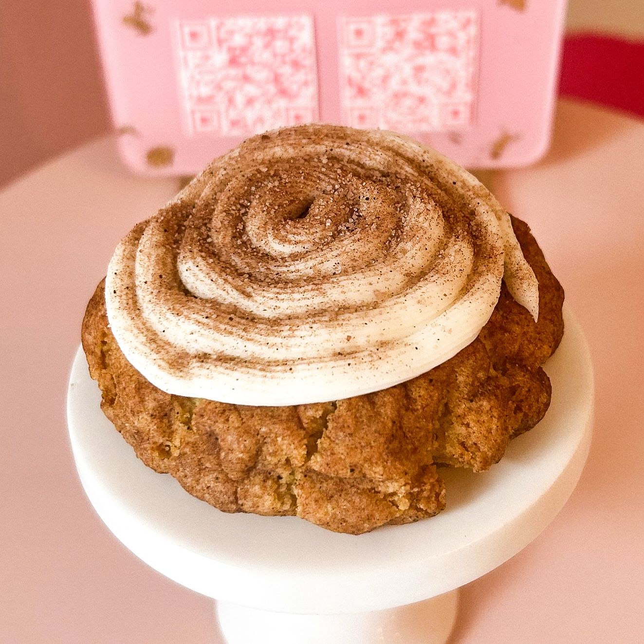 Galleta estilo New York de 100 g, caramelizada con azúcar, canela y topping glaseado de queso crema.