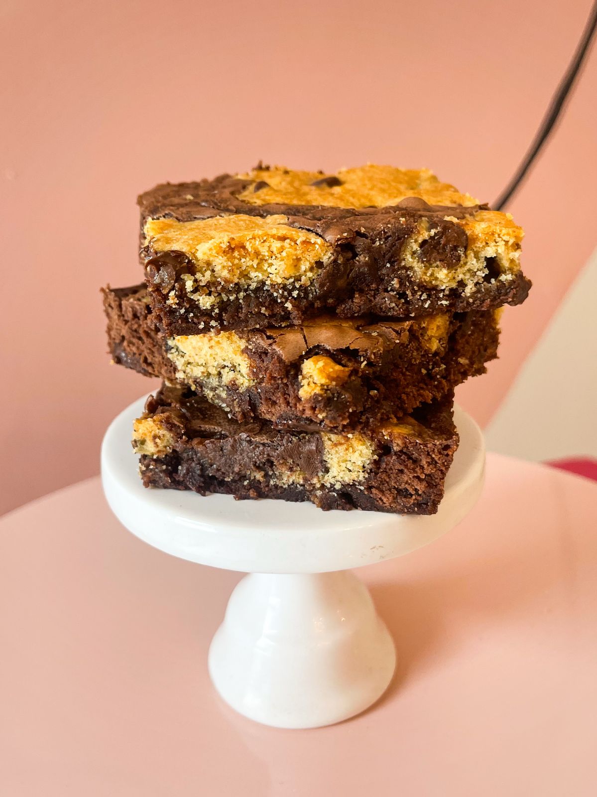 Clásico brownie chocolatoso y denso, con caramelo al centro y combinado con galleta de chispas de chocolate encima.