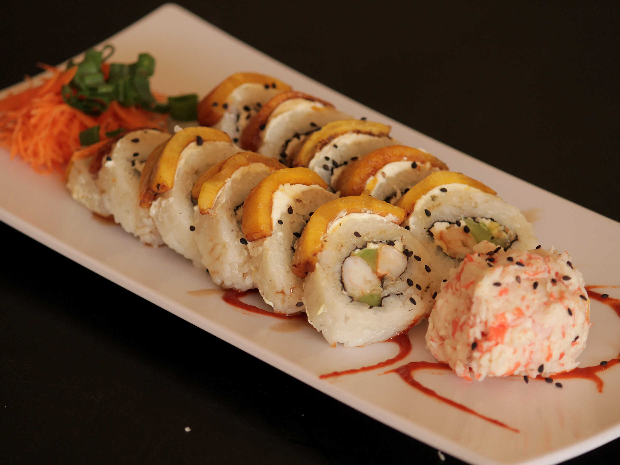Dentro: camarón, philadelphia, aguacate y pepino. Encima: philadelphia, plátano macho frito bañado en salsa de anguila.