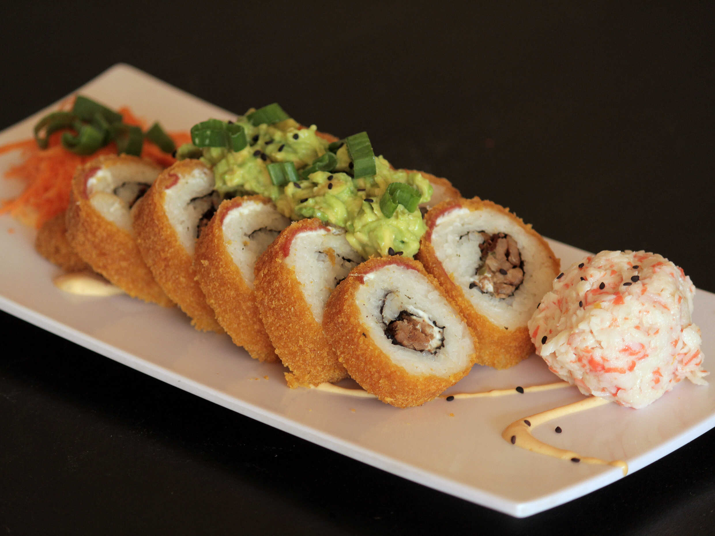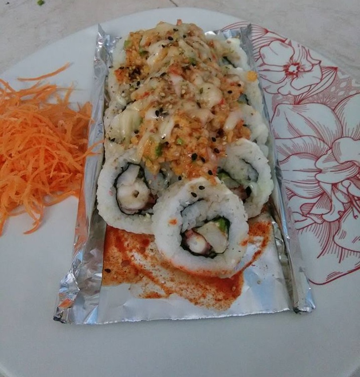 Dentro: surimi empanizado, aguacate y philadelphia. Encima: philadelphia, camarón, aguacate, pulpo, salmón, tampico y aderezo.