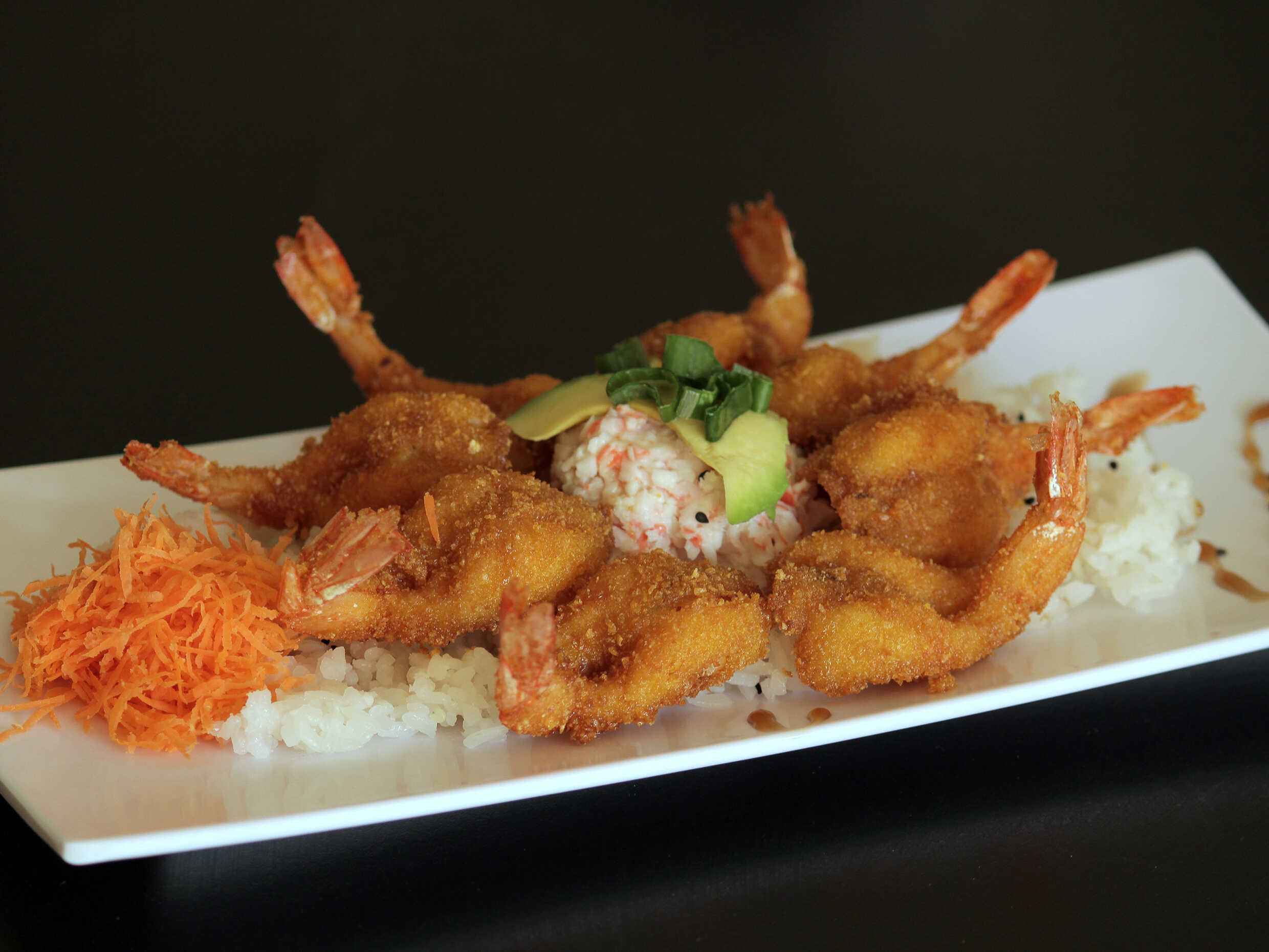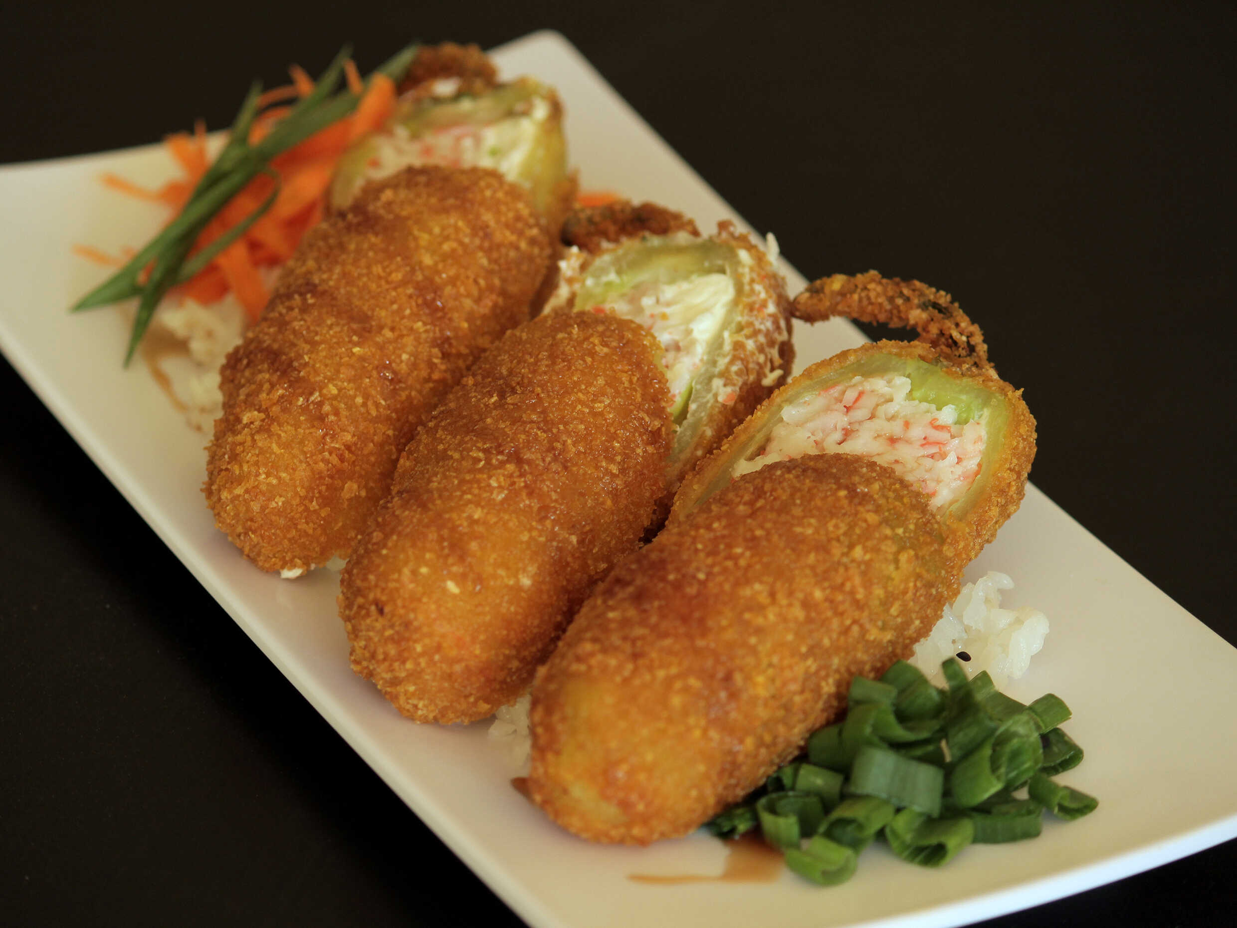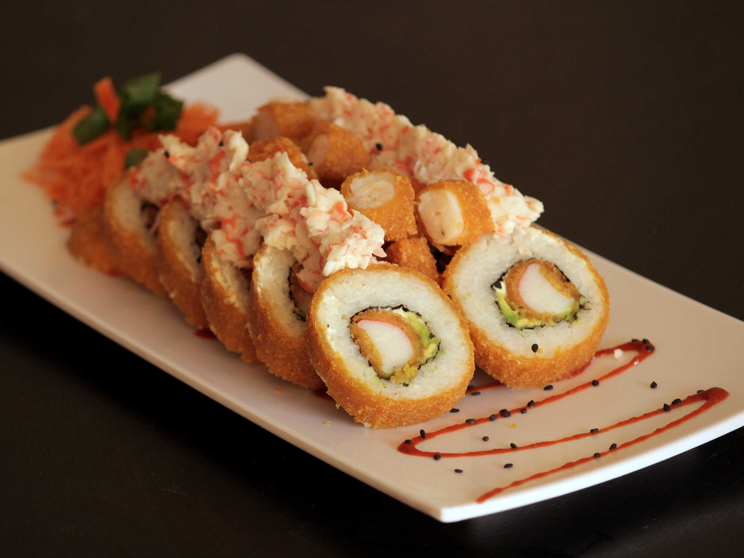 Dentro: surimi empanizado, aguacate y pepino. Encima: philadelphia, tampico y camarón empanizado.