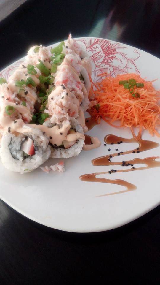 Dentro: surimi, philadelphia, aguacate y pepino. Encima: Philadelphia, tampico, cebollín bañado con aderezo y salsa de anguila.