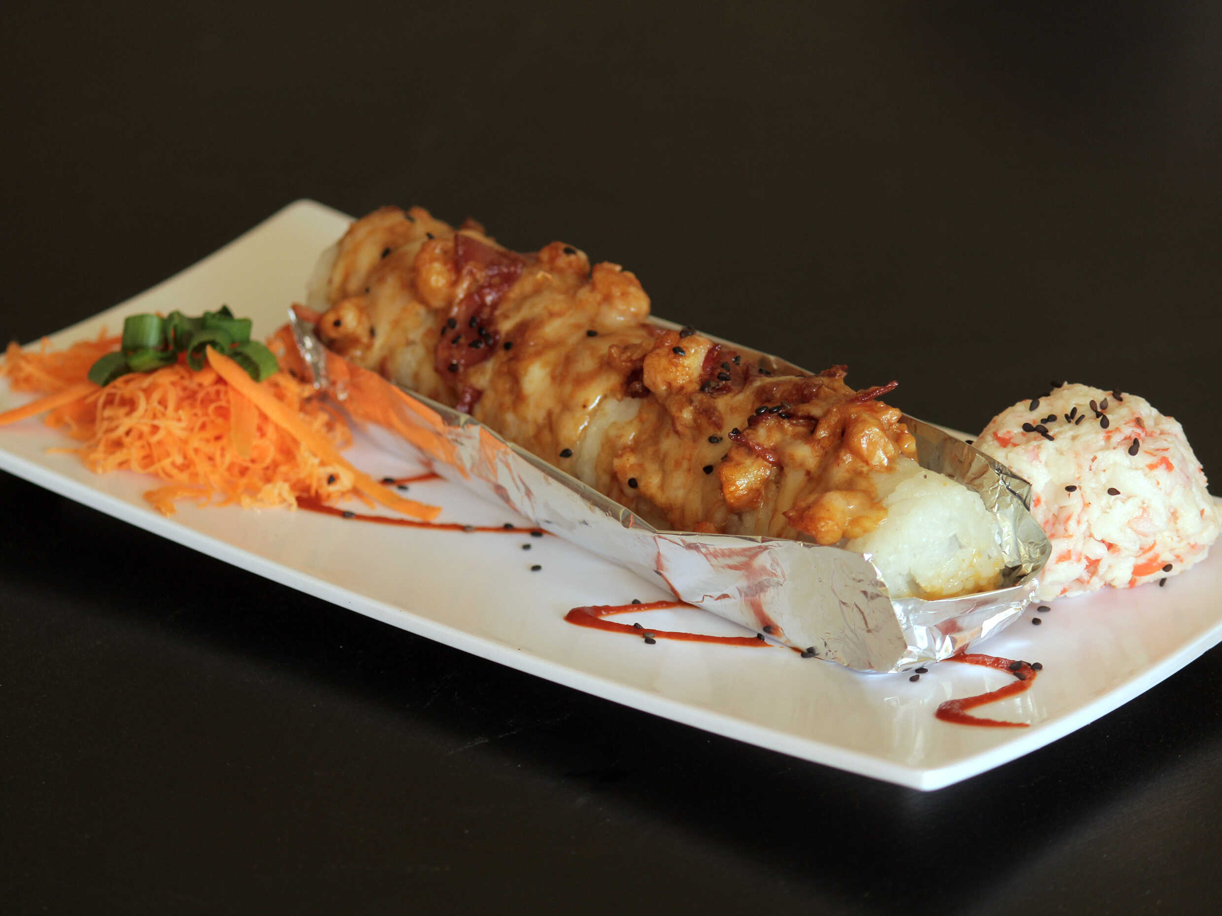 Dentro: surimi empanizado, aguacate y philadelphia. Encima: camarón, philadelphia, gratinado de pulpo y sriracha.
