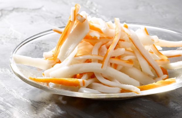 Dentro: surimi empanizado y pepino. Encima: philadelphia y aguacate.