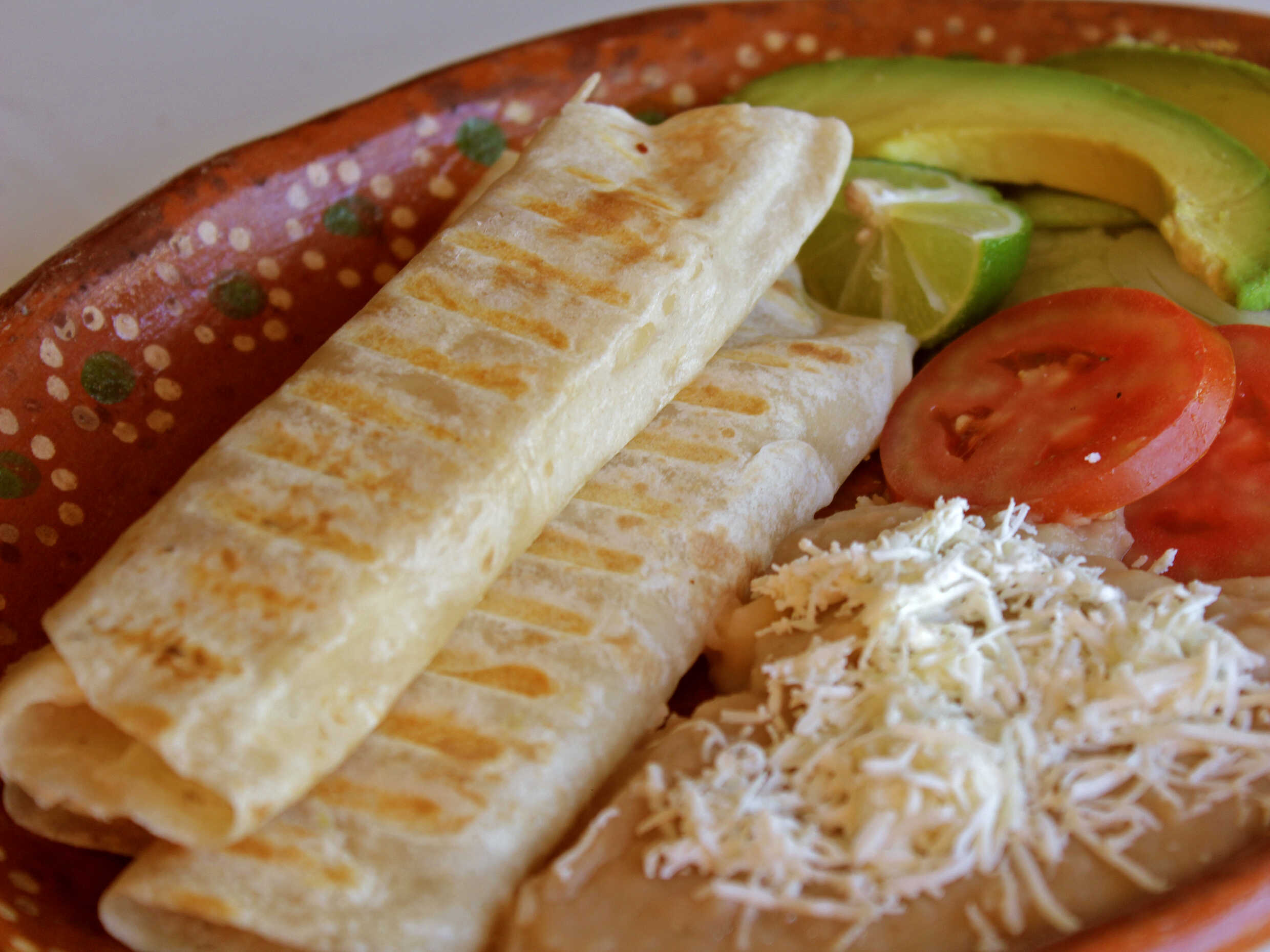 Con 2 quesadillas, arroz, frijoles con queso y ensalada.