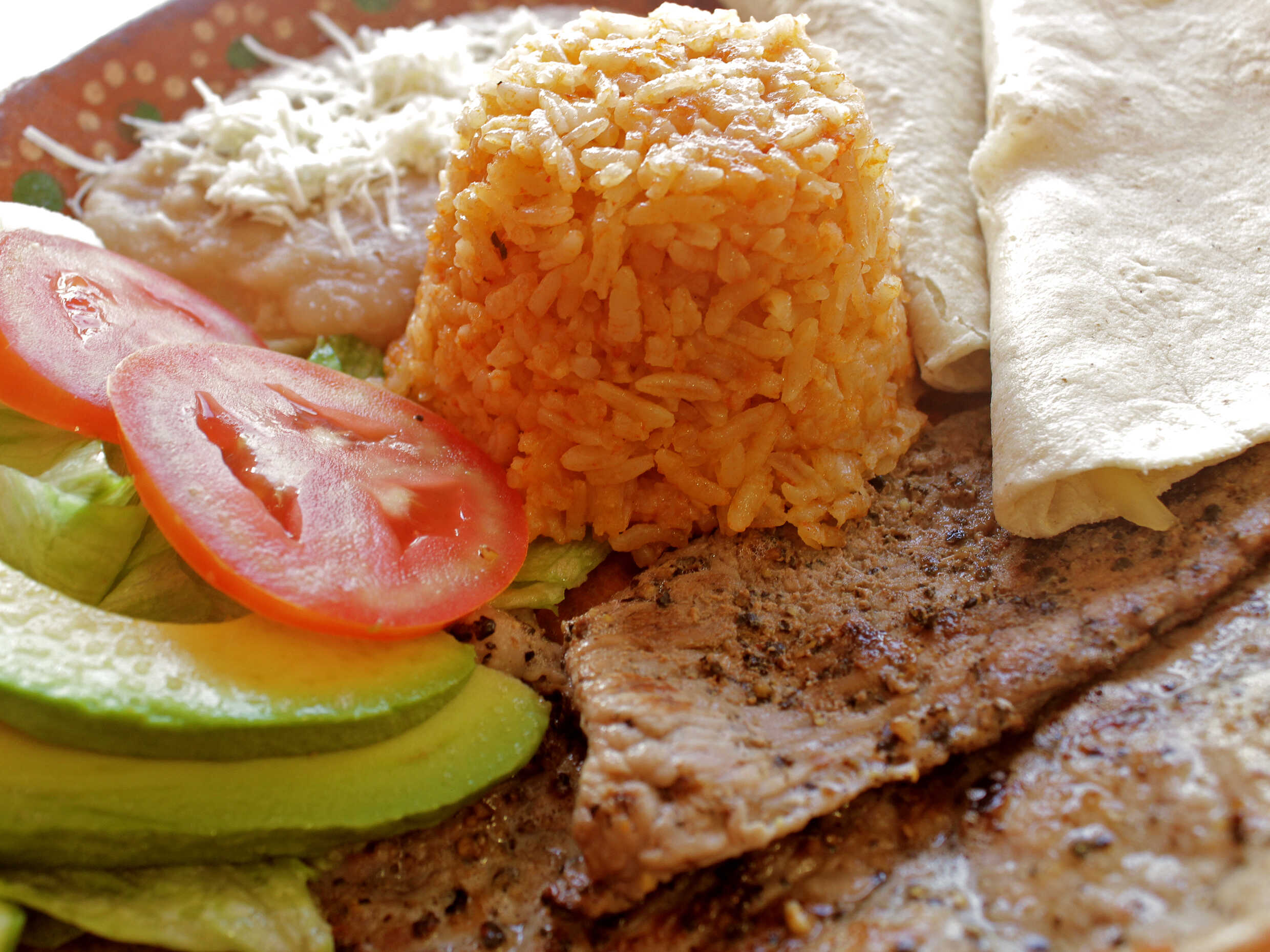 Carne asada y filete empanizado, acompañado de arroz, frijoles con queso y ensalada.