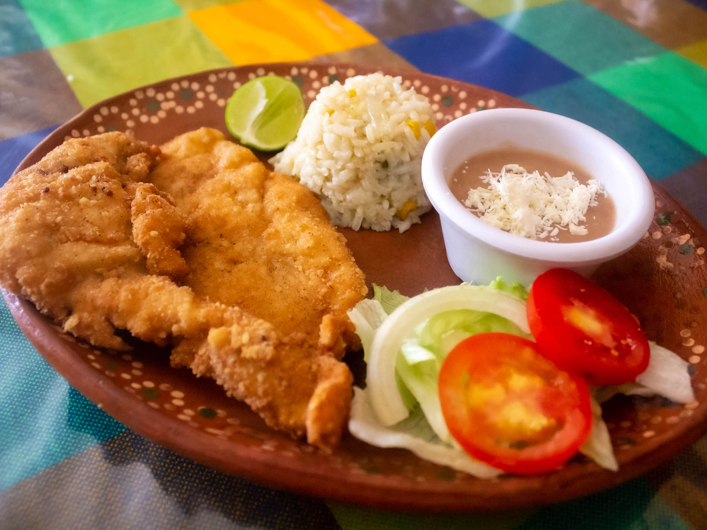 Acompañado de ensalada, arroz y frijoles con queso.