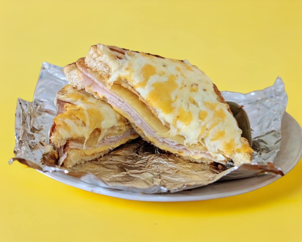 Rebanadas de pan doradas con mantequilla al sartén. rellenas de huevo, queso manchego, queso amarillo, jamón o tocino.
