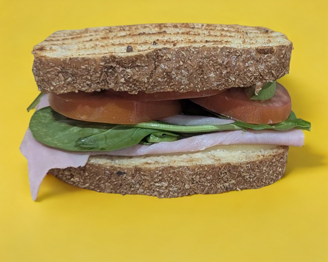 Sándwich de jamón de pechutga horneada. Pan multigrano cero, jamón, mayonesa, queso manchego, tomate, cebolla y espinacas.
