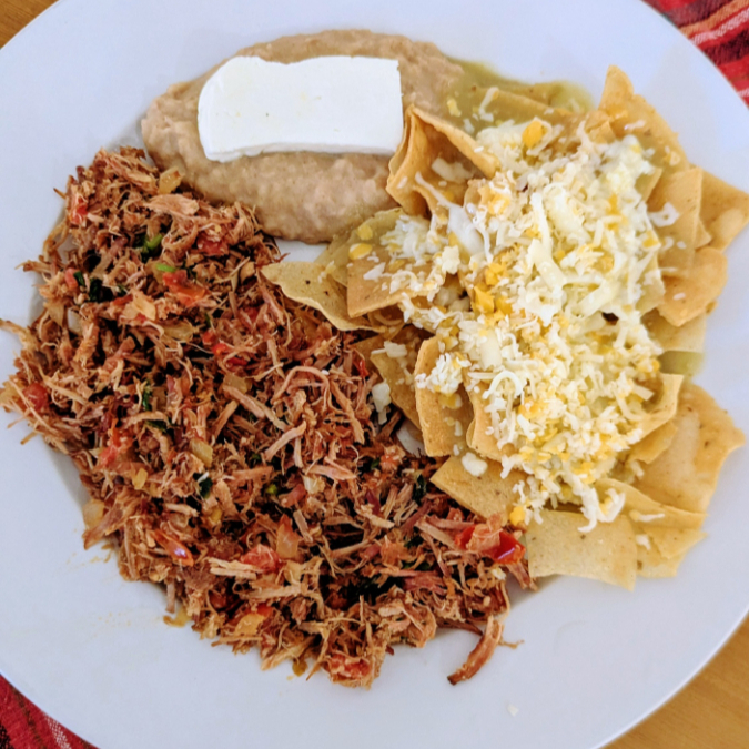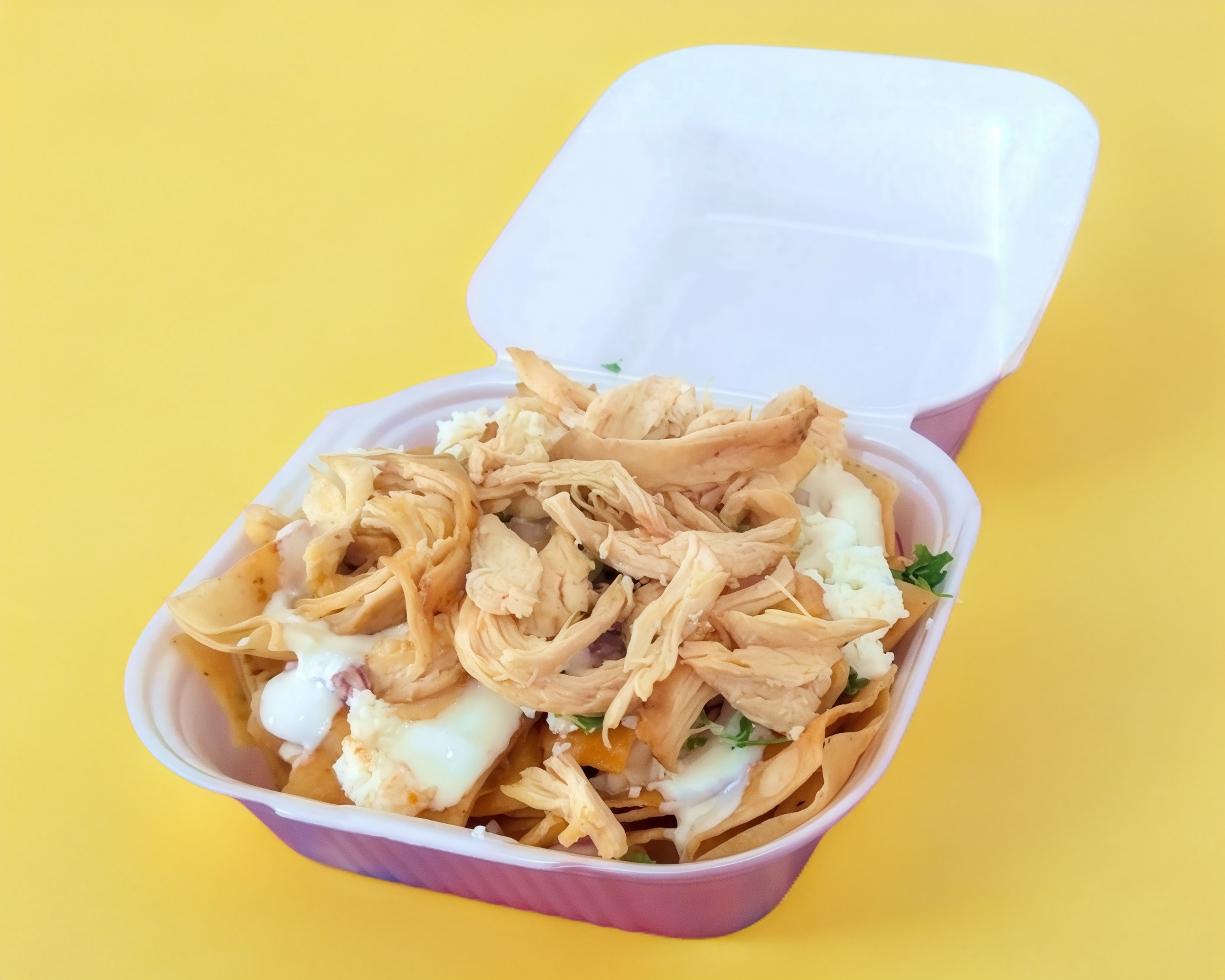 Crujientes tortillas fritas bañados en salsa, pechuga de pollo a la parrilla con toping de queso ranchero fresco, crema, cebolla y cilantro.