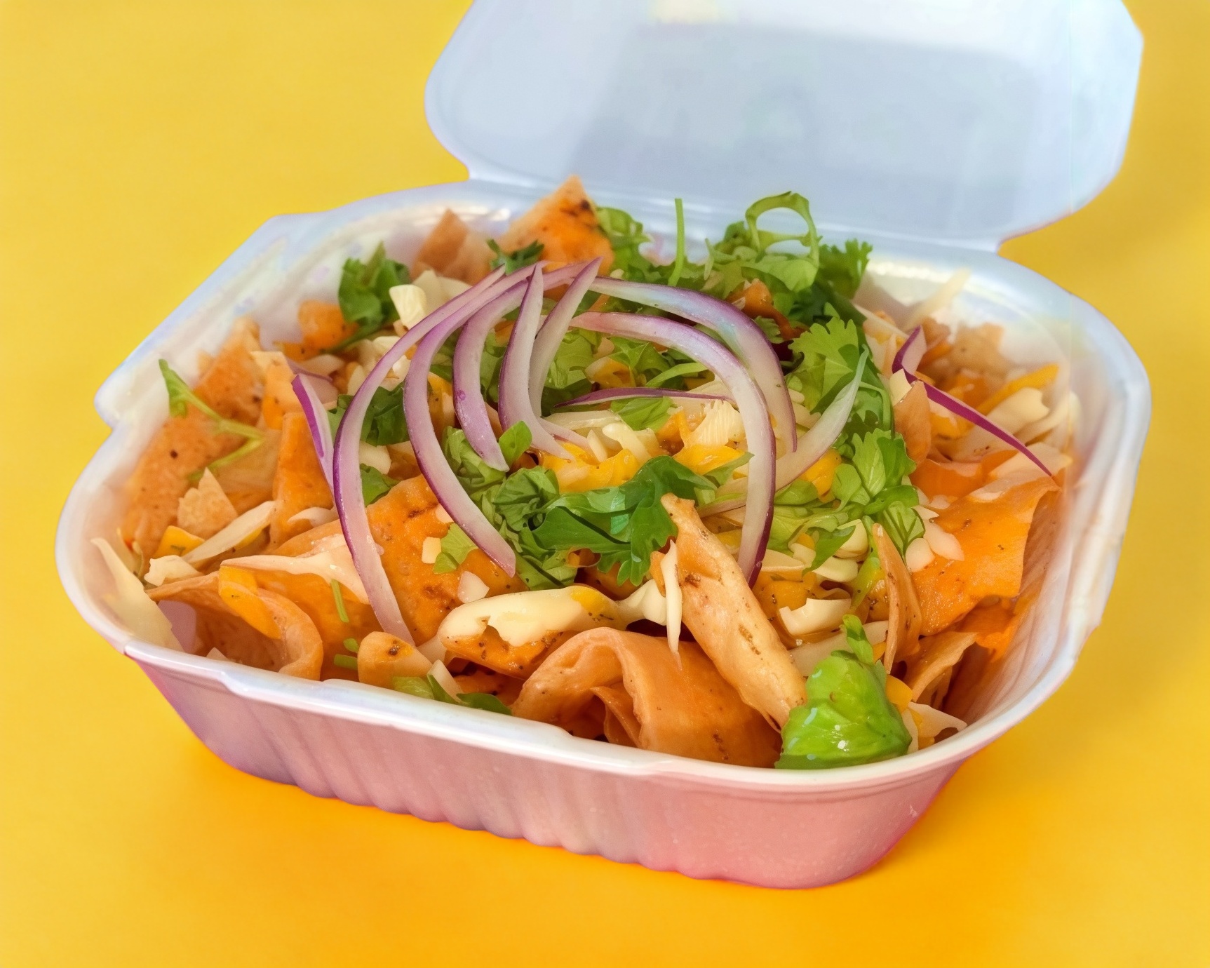 Tortilla crujiente, salsa de preferencia, cebolla y cilantro.