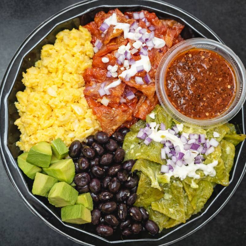 Huevos revueltos, porción de chilaquiles rojos y verdes con cebolla morada, queso panela y crema, frijol negro entero, aguacate en cubos. Complemento: Salsa tatemada