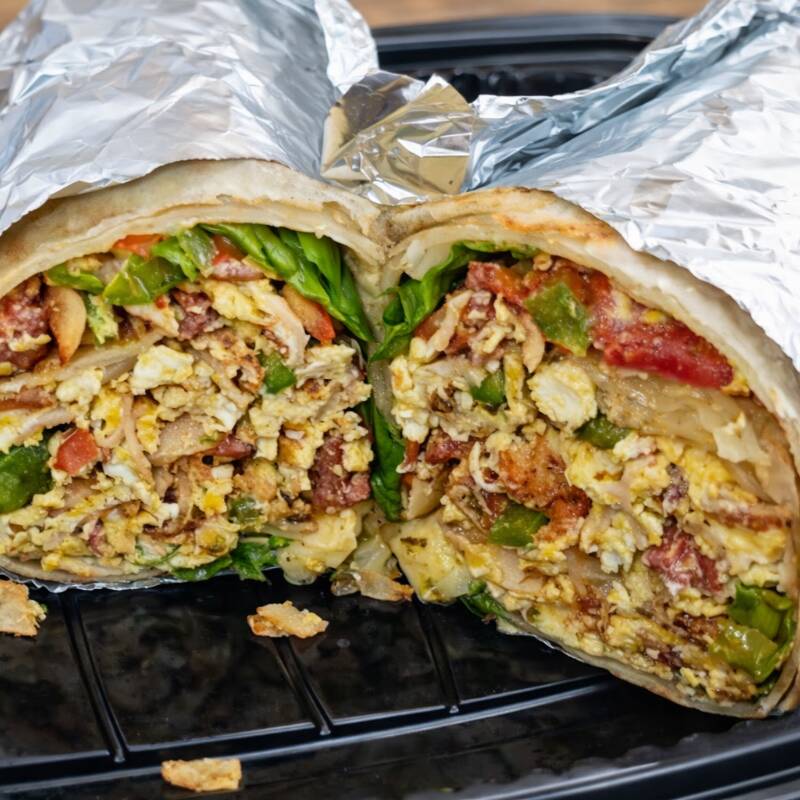 Huevos revueltos con jamón, tocino, pimiento, cebolla salteados, queso manchego envuelto en tortilla de harina con tomate, aguacate y espinaca.