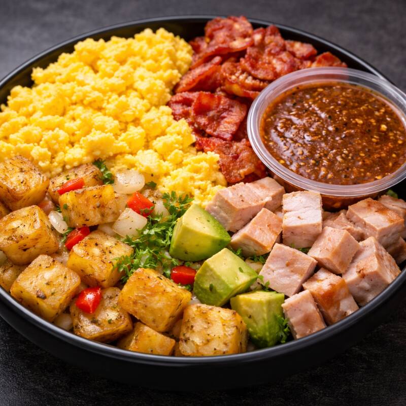 Huevos revueltos, tocino, jamón de pavo, cubos de papa salteada, aguacate en cubos. Complemento: Salsa tatemada.