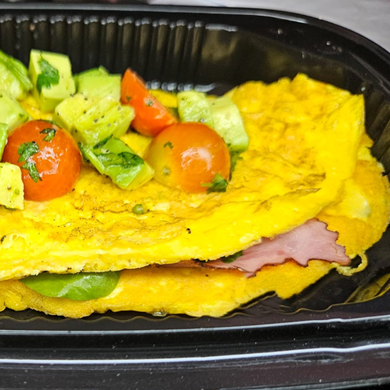 Omelette 3 huevos, relleno de pechuga de pavo, roast beef, queso manchego y espinaca. Topping de ensalada de aguacate y tomate cherry