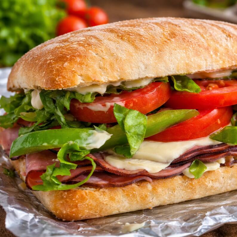 Pan ciabatta, roast beef, jamón y pechuga de pavo, manchego y mix de lechugas con tomate, espinaca, pepino y pimiento. Aceite de oliva.