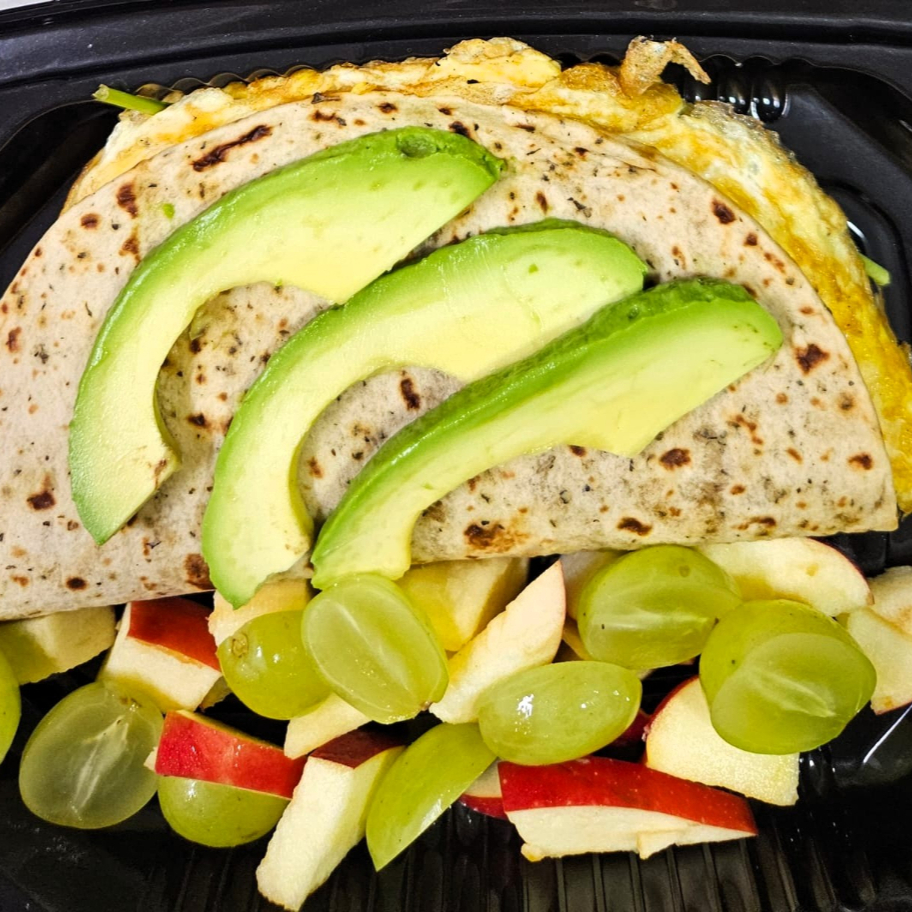 Omelette envuelto en panina integral , relleno de roast beef, pechuga de pavo, espinaca, queso manchego. Topping de aguacate. Guarnición: fruta