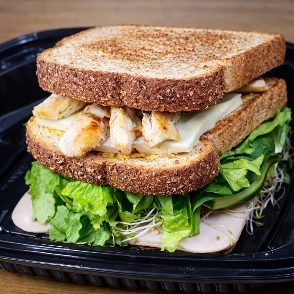 Pollo, jamón de pavo, panela, tomate, pepino, aguacate, cebolla, lechuga, espinaca y germinado, pan multigrano, aderezo Dijon.