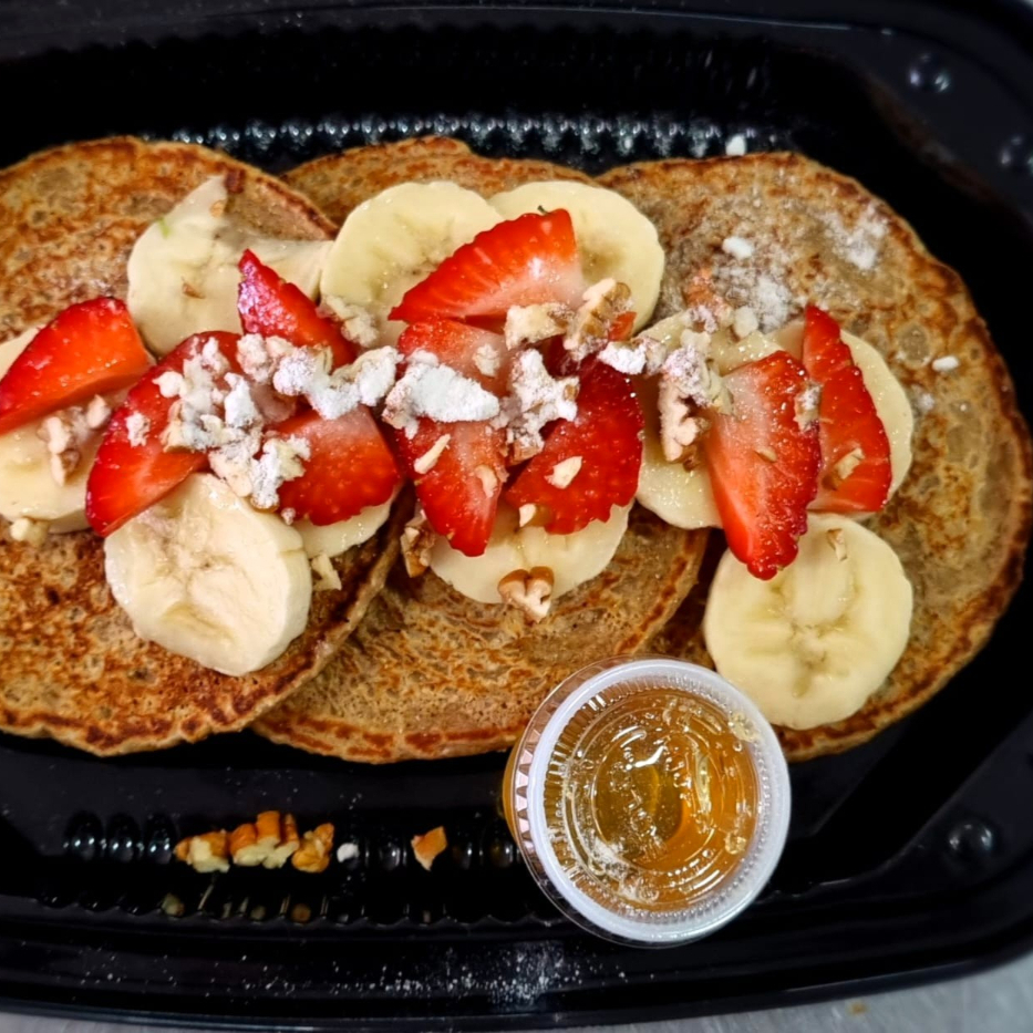 Hotcakes de harina integral de avena con miel de abeja y topping de fruta, nueces y toque de azúcar glass.