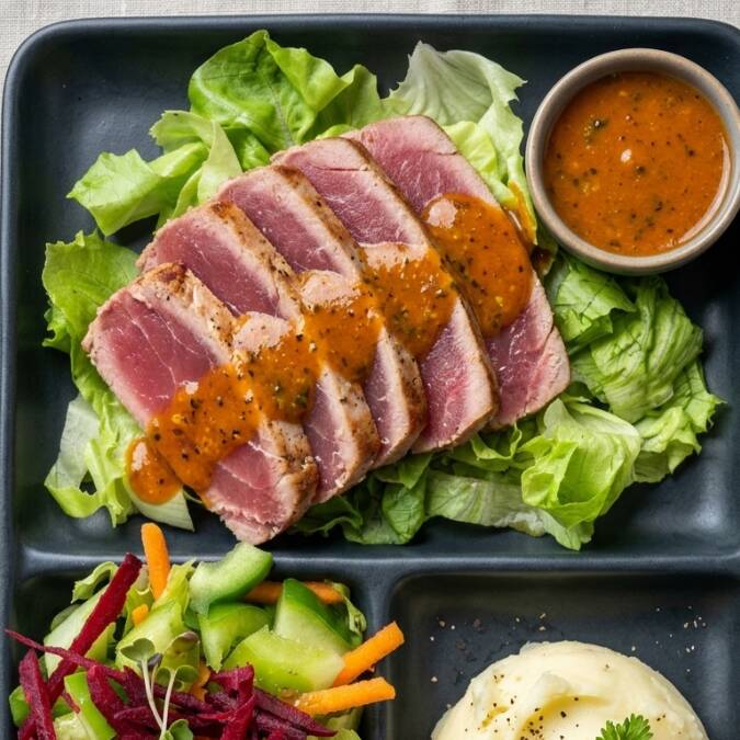 Lomo de atun a la plancha bañado en salsa de mango y un toque de ajonjoli, quinoa a la jardinera y ensalada mixta