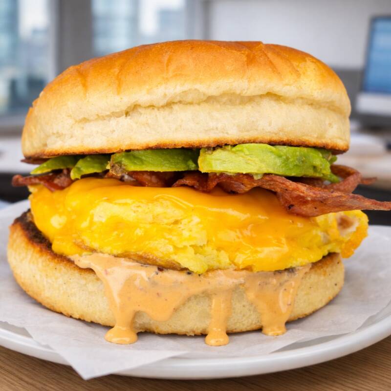 Deliciosa mezcla de pan brioche con mantequilla, huevo revuelto con pechuga de pavo, tiras de tocino, aguacate, queso americano, y aderezo chipotle.