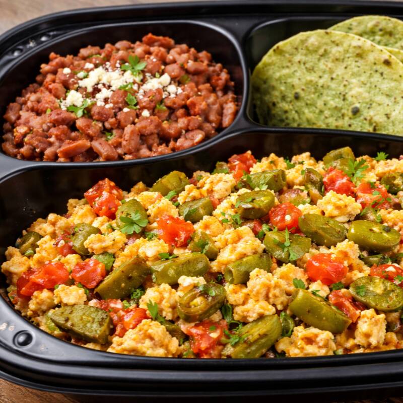 Nopales a la mexicana revueltos con huevo. Guarnición: Frijoles y tortillas de nopal.